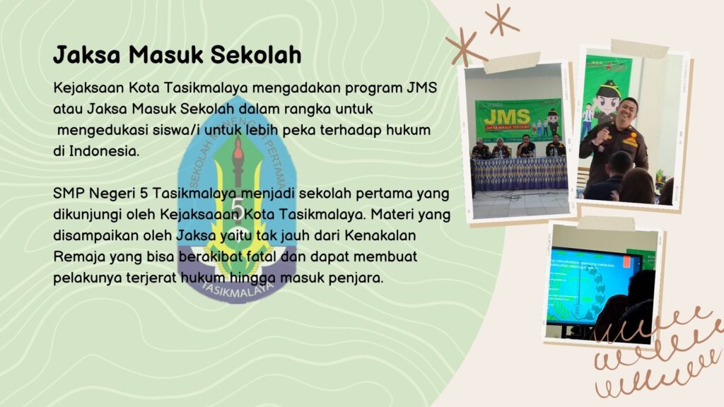 Kamis, 26 Januari 2023 SMP Negeri 5 Tasikmalaya diprcaya sebagai salah satu sekolah yang termasuk dalam program Kejaksaan yakni, Jaksa Masuk Sekolah. Kejaksaan Negeri Kota Tasikmalaya.